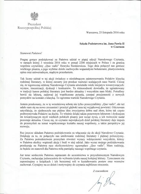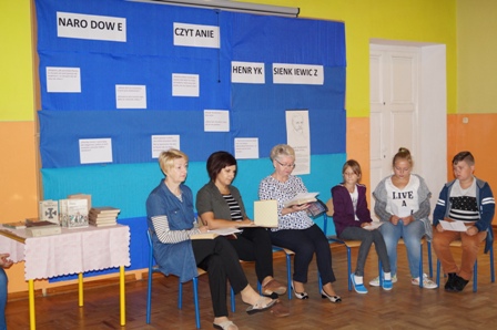5 września 2016r. przystąpiliśmy do kolejnej edycji ogólnopolskiej akcji „Narodowe czytanie”, zainicjowanej przez prezydenta Bronisława Komorowskiego i kontynuowana przez Andrzeja Dudę. Akcję rozpoczęła uczennica klasy VI prezentując założenia akcji. Następnie fragmenty „Quo vadis” przeczytały zgromadzonej społeczności szkolnej: Pani Dyrektor Elżbieta Myszyńska, Pani Jadwiga Melewska, Pani Katarzyna Kępińska oraz uczniowie klasy V.