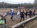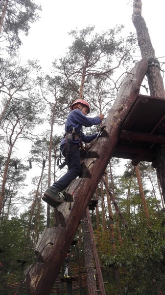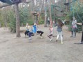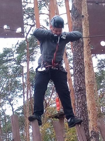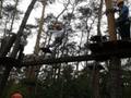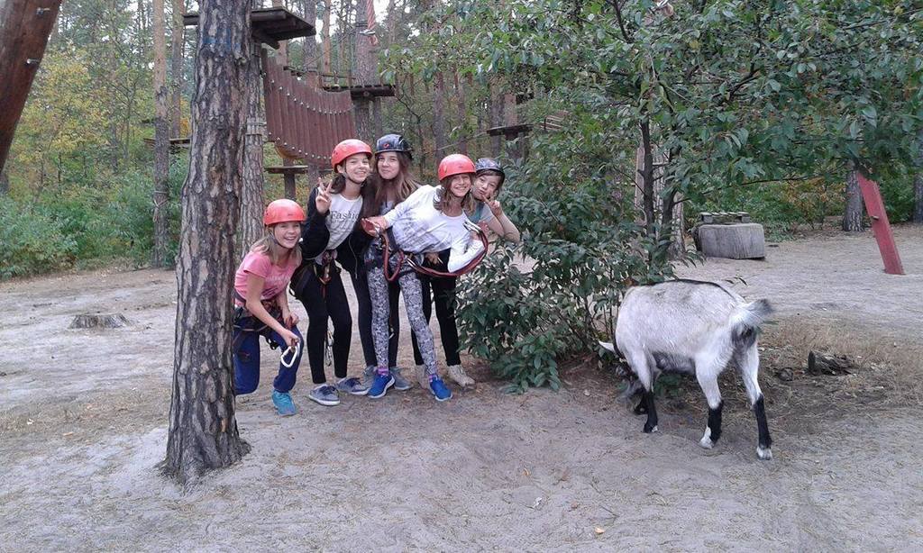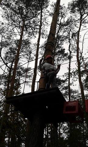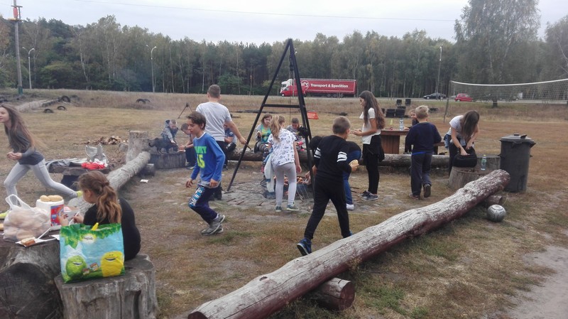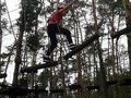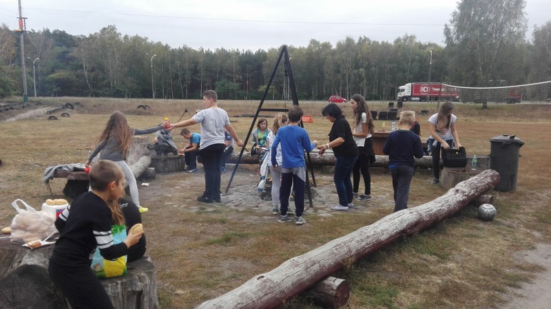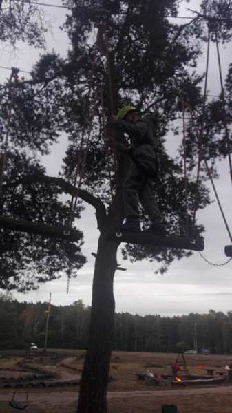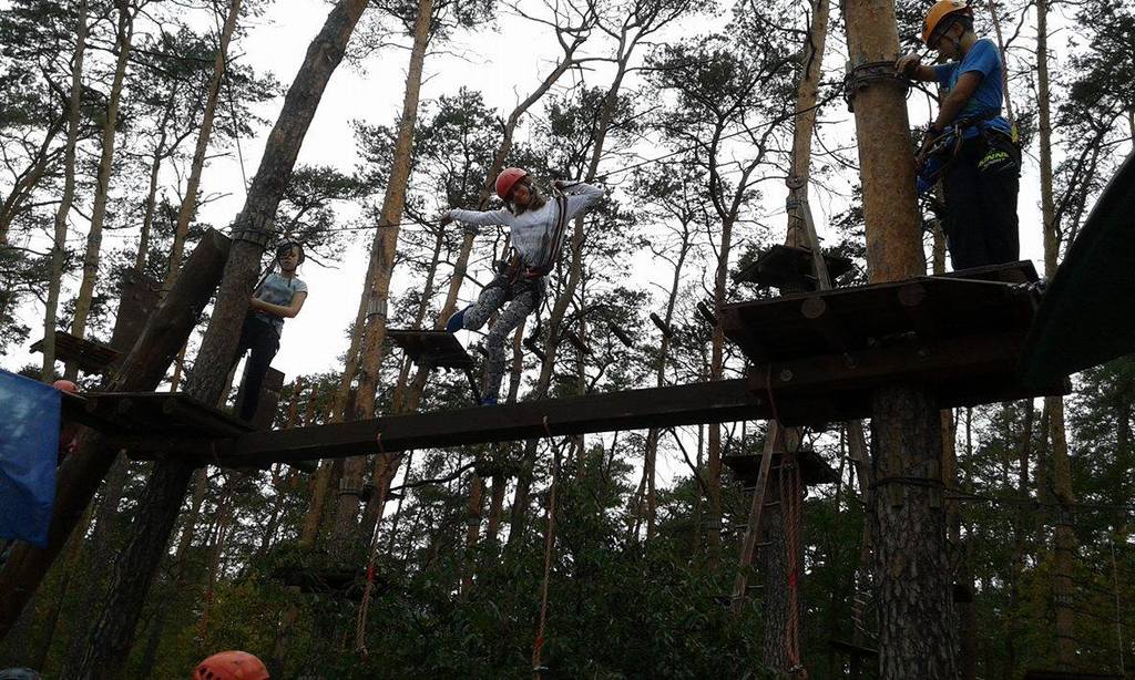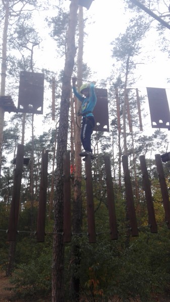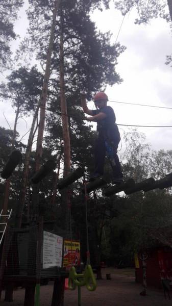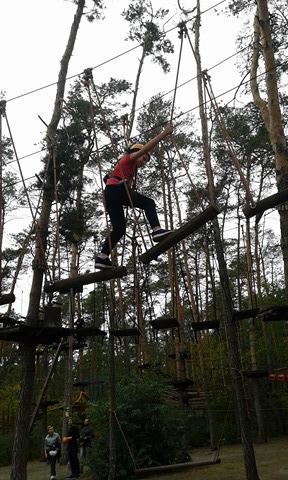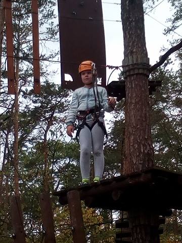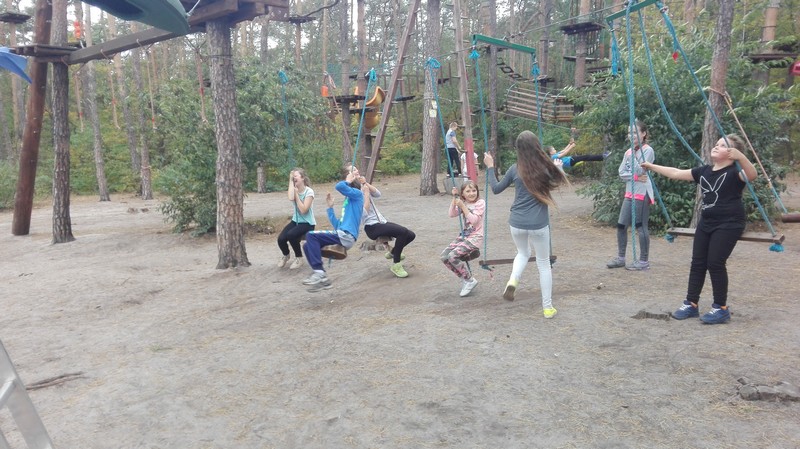 Po krótkiej przejażdżce autobusem dotarliśmy na miejsce. Tam czekali na nas instruktorzy, którzy przeprowadzili niezbędne szkolenie wspinaczkowe. Po kilku minutach dzieci ubrane w specjalne uprzęże gotowe były do wejścia na "ścieżkę". Zabawa polegała na przejściu wyznaczonej trasy i pokonaniu przeszkód zamontowanych na różnych wysokościach, pomiędzy drzewami. Każdy uczestnik przypięty był do specjalnej liny, gwarantującej bezpieczne pokonanie trasy i uniknięcie upadku. Dzieci poradziły sobie naprawdę wyśmienicie. Po sporym wysiłku fizycznym, wszyscy z wielką ochotą zasiedliśmy do wspólnego grillowania.