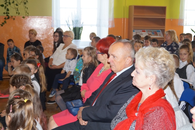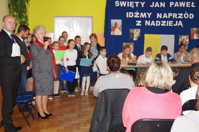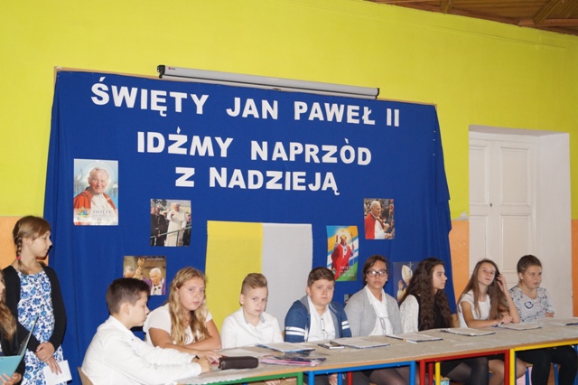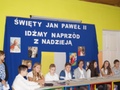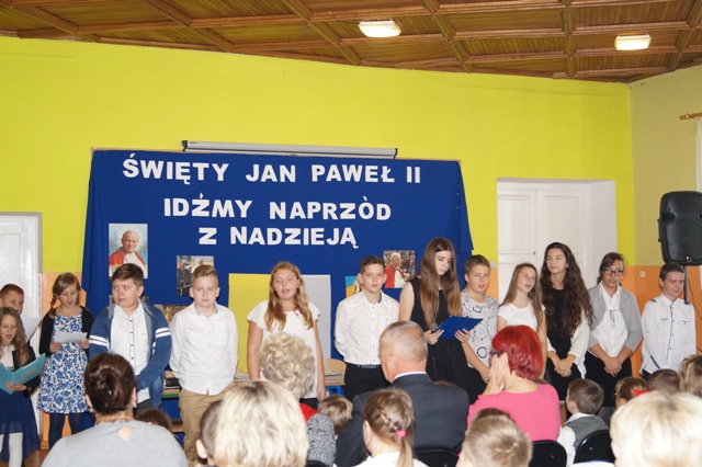 Uroczyste obchody Patrona Naszej Szkoły Jana Pawła II rozpoczęliśmy o godzinie 9.00 Mszą Świętą pod przewodnictwem ks. Proboszcza Henryka Wysockiego w kościele parafialnym p.w. Św. Michała Archanioła w Czarnem. Uczniowie klas I-VII w montażu słowno-muzycznym przypomnieli nam postać Świętego Jana Pawła II. Usłyszeliśmy fakty i anegdoty z życia papieża. Tegoroczne hasło Dnia Papieskiego „Idźmy Naprzód z Nadzieją” było myślą przewodnią wzruszającego przedstawienia. Na uroczystym apelu nie zabrakło zacnych gości. Swoją obecnością Dzień Patrona uświetnili: Wójt Gminy Wielgie Pan Tadeusz Wiewiórski, Przewodnicząca Rady Gminy Pani Halina Szypka, Sołtys wsi Czerskie Rumunki Pani Krystyna Walkowicz, Przewodnicząca Rady Rodziców Pani Katarzyna Kowalska oraz licznie zgromadzeni rodzice. Za szkolne obchody Dnia Patrona odpowiedzialni byli: p. Krzysztof Fydryszewski, p. Jarosłąw Jeżewski, p. Monika Trzeciakowska i p. Joanna Cieślak.