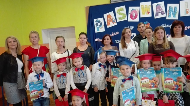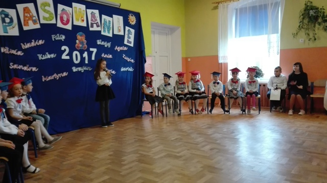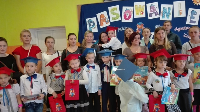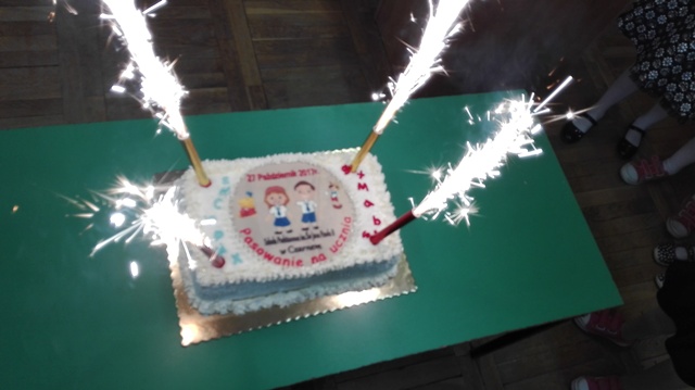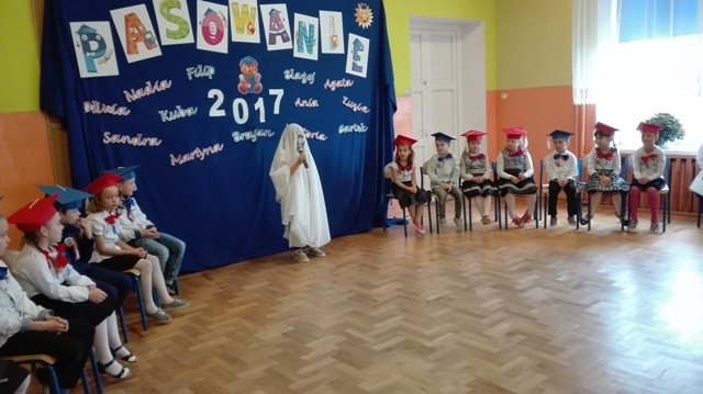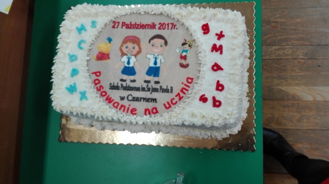 O godz. 9 odbyła się oficjalna uroczystość w świetlicy szkolnej, na którą zostali zaproszeni nauczycie, pracownicy szkoły, rodzice oraz koleżanki i koledzy z klas starszych. Dzieci zaprezentowały część artystyczną, którą przygotowały pod czujnym okiem wychowawcy klasy, pani Katarzyny Pietrzak. Recytowały piękne wiersze, tańczyły i śpiewały. Zdały też swój pierwszy egzamin odpowiadając na różne pytania starszych kolegów i koleżanek. Dzieci złożyły przysięgę, a Pani Dyrektor dokonała pasowania na ucznia Szkoły Podstawowej im. Jana Pawła II w Czarnem.Najmłodsi uczniowie otrzymali prezenty od Samorządu Uczniowskiego i Rady Rodziców. Niespodzianką były upominki od KDBS O/Wielgie.