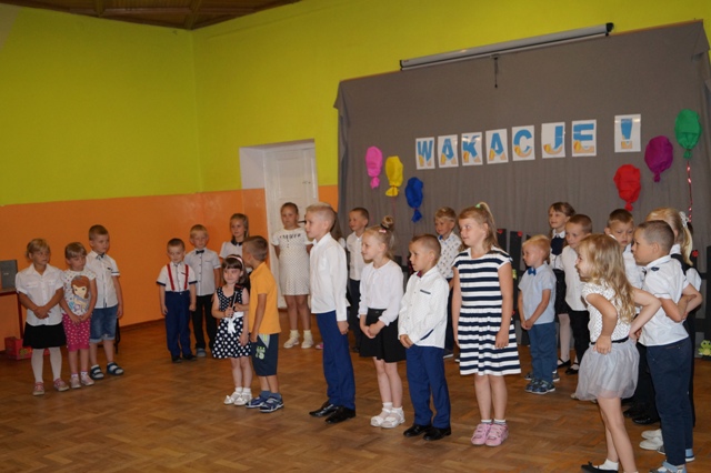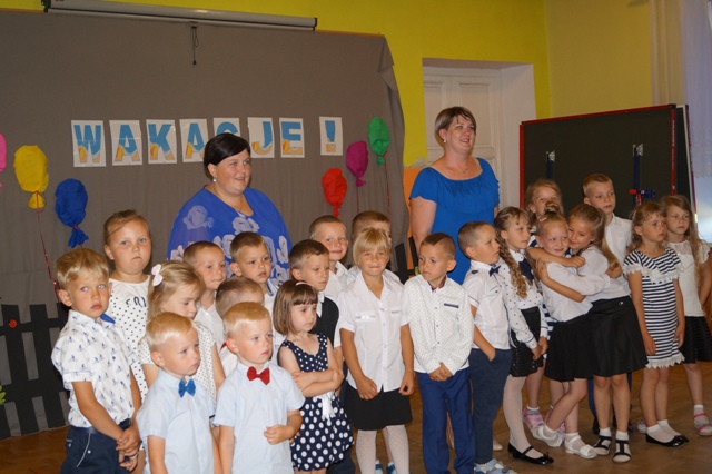 Był to czas niezwykły i niezapomniany, zarówno dla dzieci, rodziców, jak i wychowawców. Skończył się bowiem okres wspólnych zabaw i spotkań, wspólnej pracy. Dzieci, z maluszków, zagubionych i nieśmiałych, stały się samodzielnymi, odważnymi starszakami, pełnymi pomysłów, ciekawymi świata, chętnymi do podejmowania nowych, coraz trudniejszych zadań. Skończył się beztroski okres i nadszedł czas na przyjęcie innych obowiązków. Przedszkolaki pod kierunkiem swoich wychowawców, p. M.Kamińskiej i p. Sylwii Żabielskiej przygotowały specjalnie na tę okazję występ artystyczny. Najmłodsi zaprezentowali wspaniały montaż słowno- muzyczny, w którym podsumowali rok spędzony w przedszkolu. Na pamiątkę tego wydarzenia dzieci otrzymały pamiątkowe dyplomy, książki ze zdjęciami. Były także życzenia i podziękowania . Dziękujemy rodzicom za wspólnie spędzony czas, pomoc i wsparcie, dzieciom natomiast życzymy udanych wakacji, samych sukcesów w szkole, uśmiechu na co dzień oraz nowych przyjaźni.