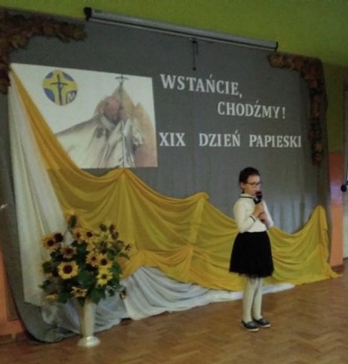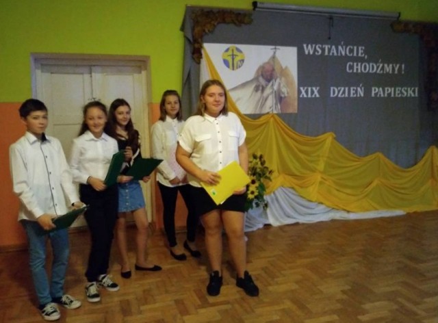 16 października w naszej szkole świętowaliśmy Dzień Patrona. Cała społeczność szkolna wzięła udział w uroczystym apelu poświęconym św. Janowi Pawłowi II. Poznaliśmy ciekawostki z życia papieża oraz przypomnielismy najważniejsze wydarzenia z Jego pontyfikatu. Rozstrzygnięto również konkurs plastyczny na portret papieża. Swoją obecnością święto szkoły zaszczycił ks. Proboszcz Henryk Wysocki, który ufundował nagrody dla zwycięzców. Zakończeniem tego uroczystego dnia była msza święta w miejscowym kościele. Organizotarami akademi byli H. Kacprzak A. Winnicka A. Kostrzewska