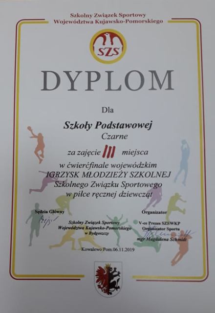 6 listopada 2019r. drużyna dziewcząt Szkolnego Klubu Sportowego Czarni-Czarne reprezentowała powiat lipnowski w ćwierćfinale wojewódzkim piłki ręcznej w Kowalewie Pomorskim. Miło mi poinformować, że dziewczęta zdobyły III miejsce w tym turnieju. Serdecznie gratuluję i życzę dalszych sukcesów drużynie oraz trenerowi SKS Czarni – Czarne p. Krzysztofowi Fydryszewskiemu. Pragnę podziękować rodzicom p. Katarzynie Kowalskiej, p. Marlenie Leszczyńskiej, p. Robertowi Kwiatkowskiemu oraz kierownik GOPS w Wielgiem p. Edycie Wiśniewskiej za wsparcie i pomoc drużynie.