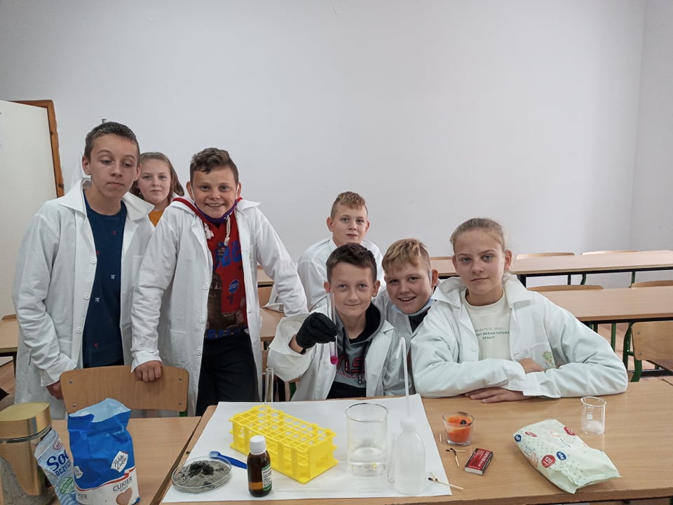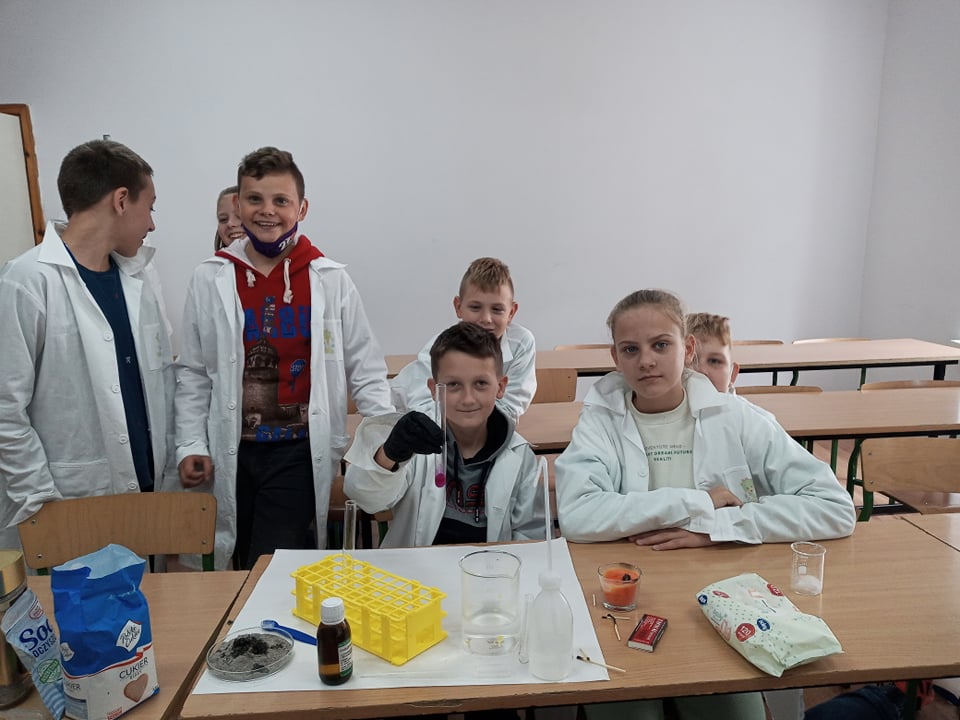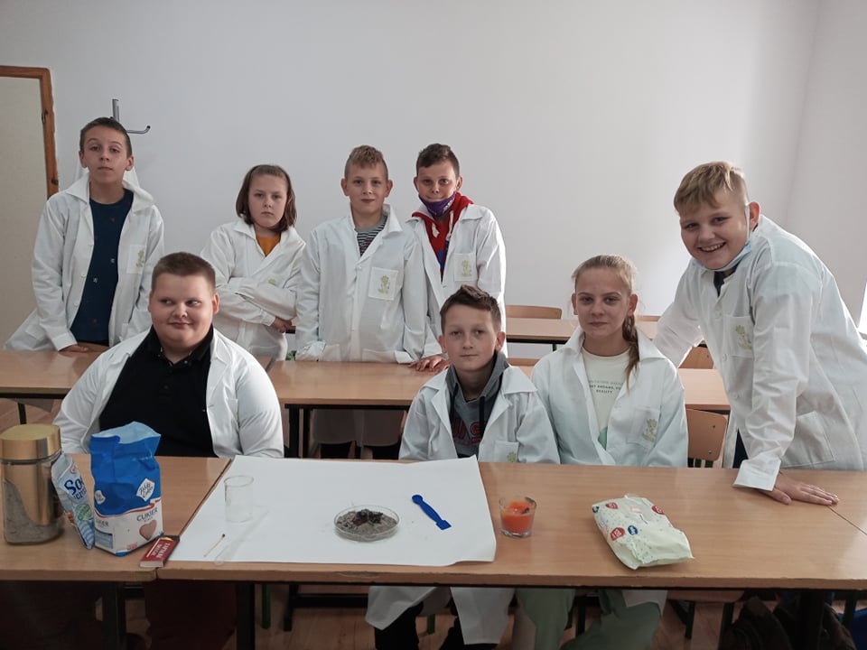 Dnia 21.09.2021r. odbyły się zajęcia rozwijające zainteresowania przyrodnicze w klasie VI. Klasa stawia pierwsze kroki w świecie chemii. Na zajęciach uczniowie poznali podstawowe zasady pracy z odczynnikami chemicznymi. Wykonaliśmy węże Faraona, sprawdziliśmy działanie stężonego kwasu siarkowego (VI) na chlorek sodu wobec wskaźników kwasowo-zasadowych. Przeprowadziliśmy również reakcje spalania siarki w tlenie i reakcje magnezu z kwasem solnym.