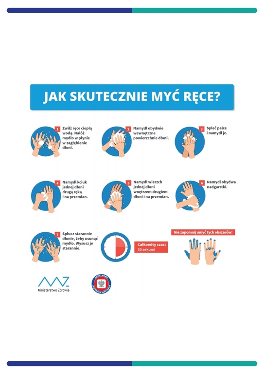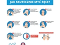 mycia rąk z użyciem ciepłej wody i mydła oraz ochrony podczas kaszlu i kichania.